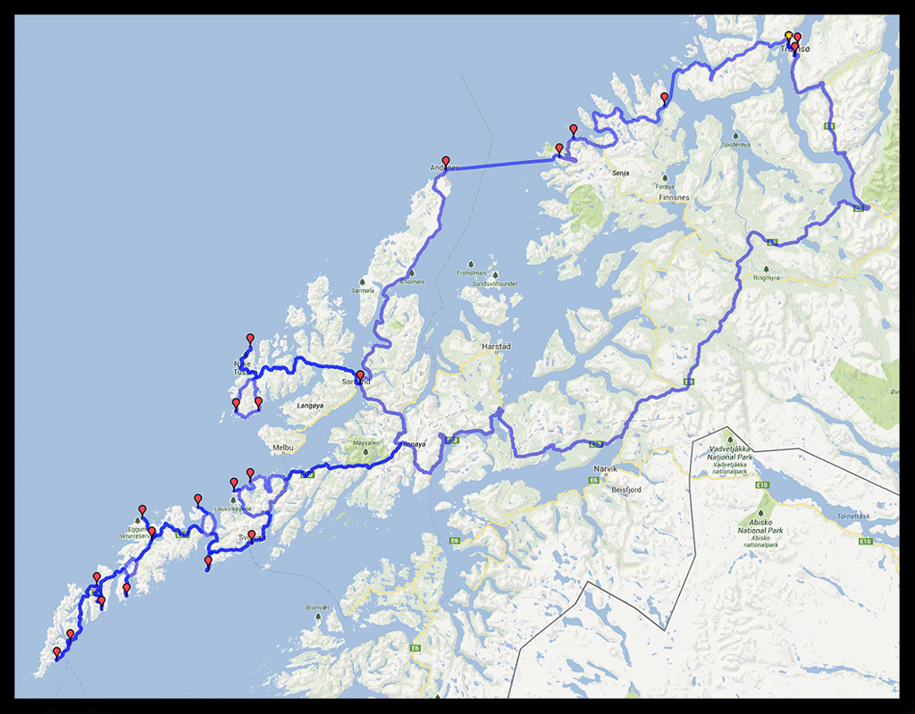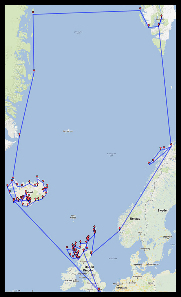 It is a significant logistical exercise involving I think 15 flights, 7 car or camper rentals, 17 ferry journeys (mainly with vehicle), 3 photographic boat or ship trips, 22 Bed and Breakfasts or hotels and taking 84 days.
