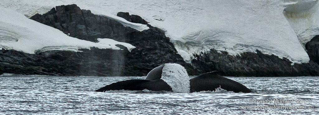 GPS Location. (Green arrow) At least as I write this, the google map is a bit misleading in that the satellite images were taken in winter and there’s a big iceberg here – so ignore that. All following images of the whales were taken close by, roughly two kilometres north of Vernadsky Station.