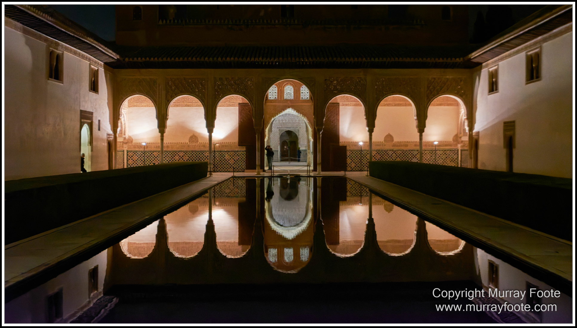 Courtyard of the Myrtles, looking north. Hall of the Ambassadors not visible behind in the dark.