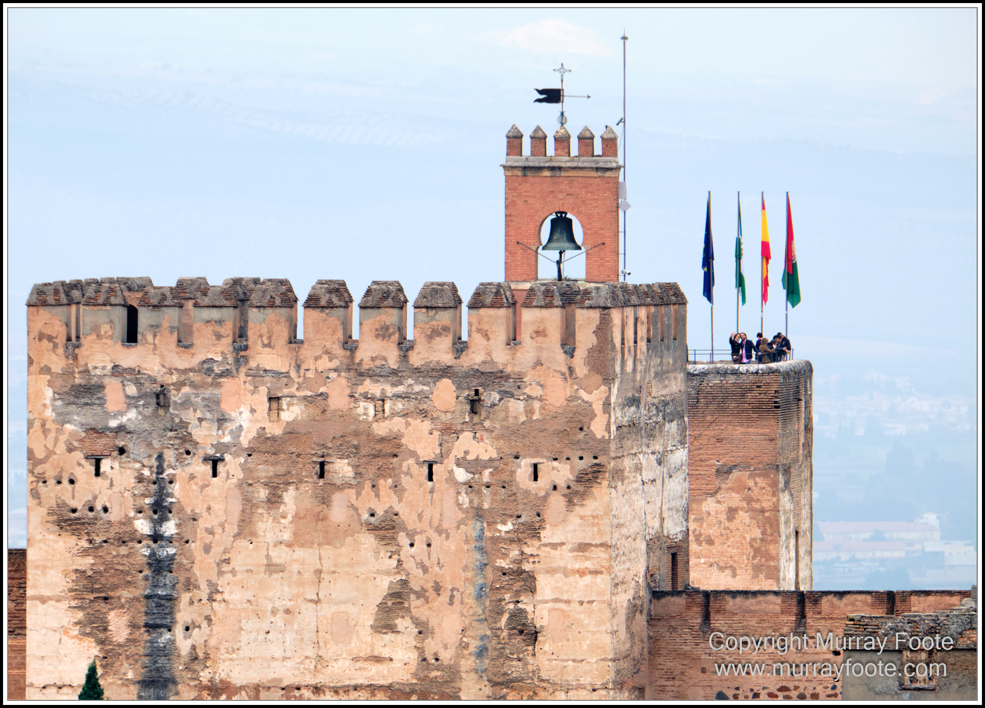 The people are standing on the top of the Torre de la Vela, at the far end of the alcazaba, about 300 metres away. The big tower in front of them is probably Torre de Comares.