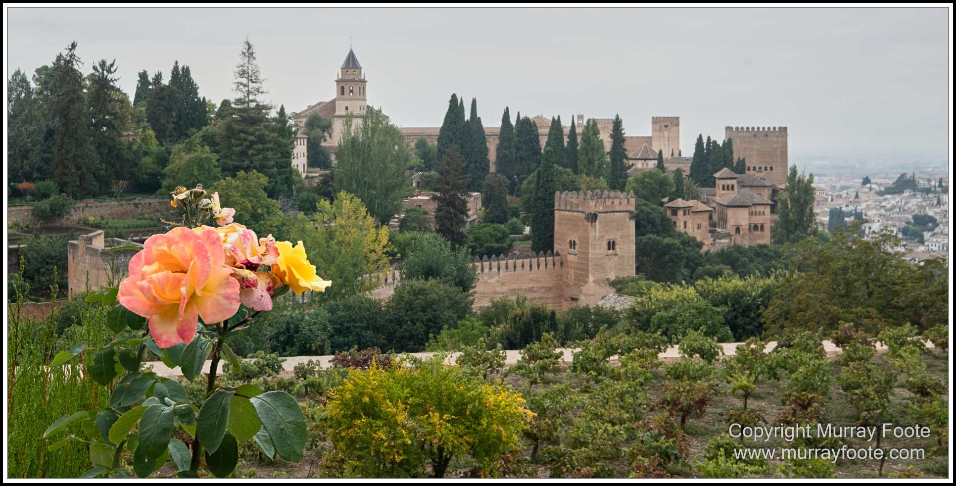 Three images showing roses (one also with marigolds), the Alhambra, and Las Huertas (market gardens) in between.