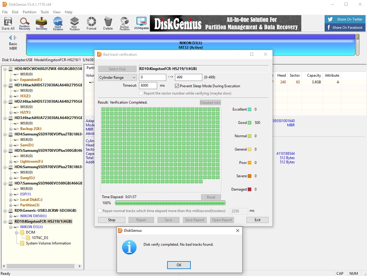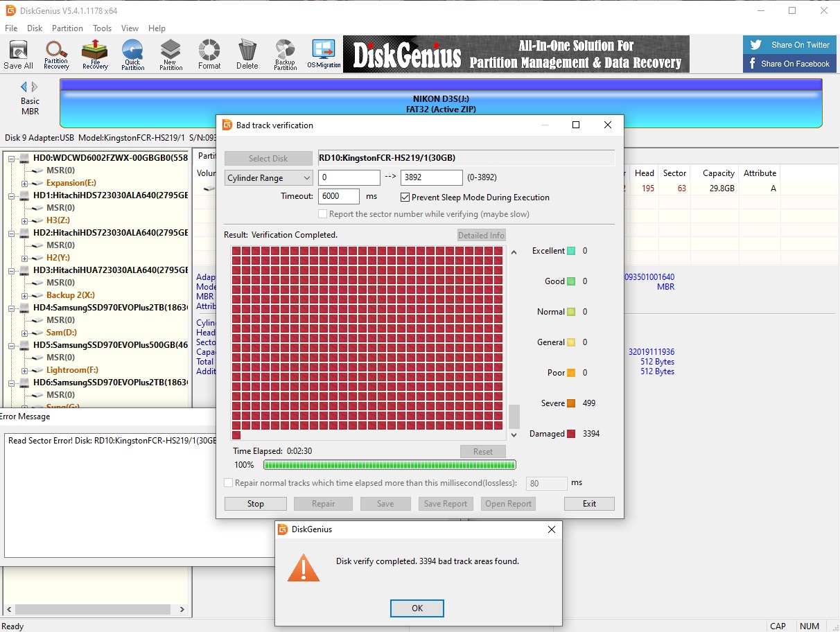 Coincidentally, I encountered a bad sector when trying to download some images from a CF card.  CF and SD cards are said to have a life of around ten years and some of mine are as old as 13 years.  So I also went through and tested all my CF cards and found two out of seven unusable due to bad sectors.  That may not mean your camera will tell you you’re about to lose some images though, so it’s a good idea to occasionally test your cards, especially the old ones.  It’s probably better to throw away a CF or SD card if it has any bad sectors.  For testing these cards I used DiskGenius because it has a good graphical interface.  (I will soon also test my SD cards, which can be up to 10 years old).