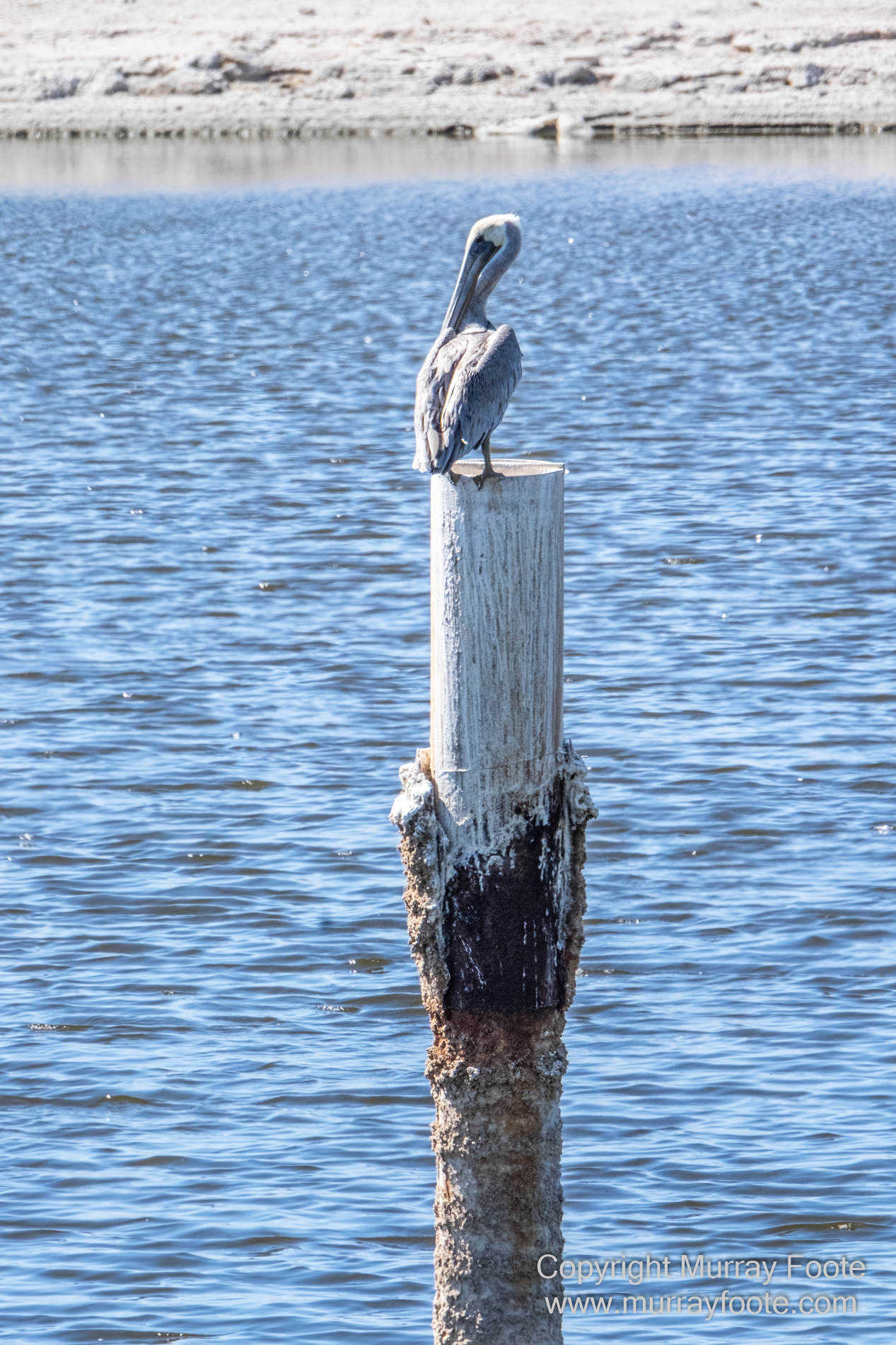 Lone pelican on a pole.