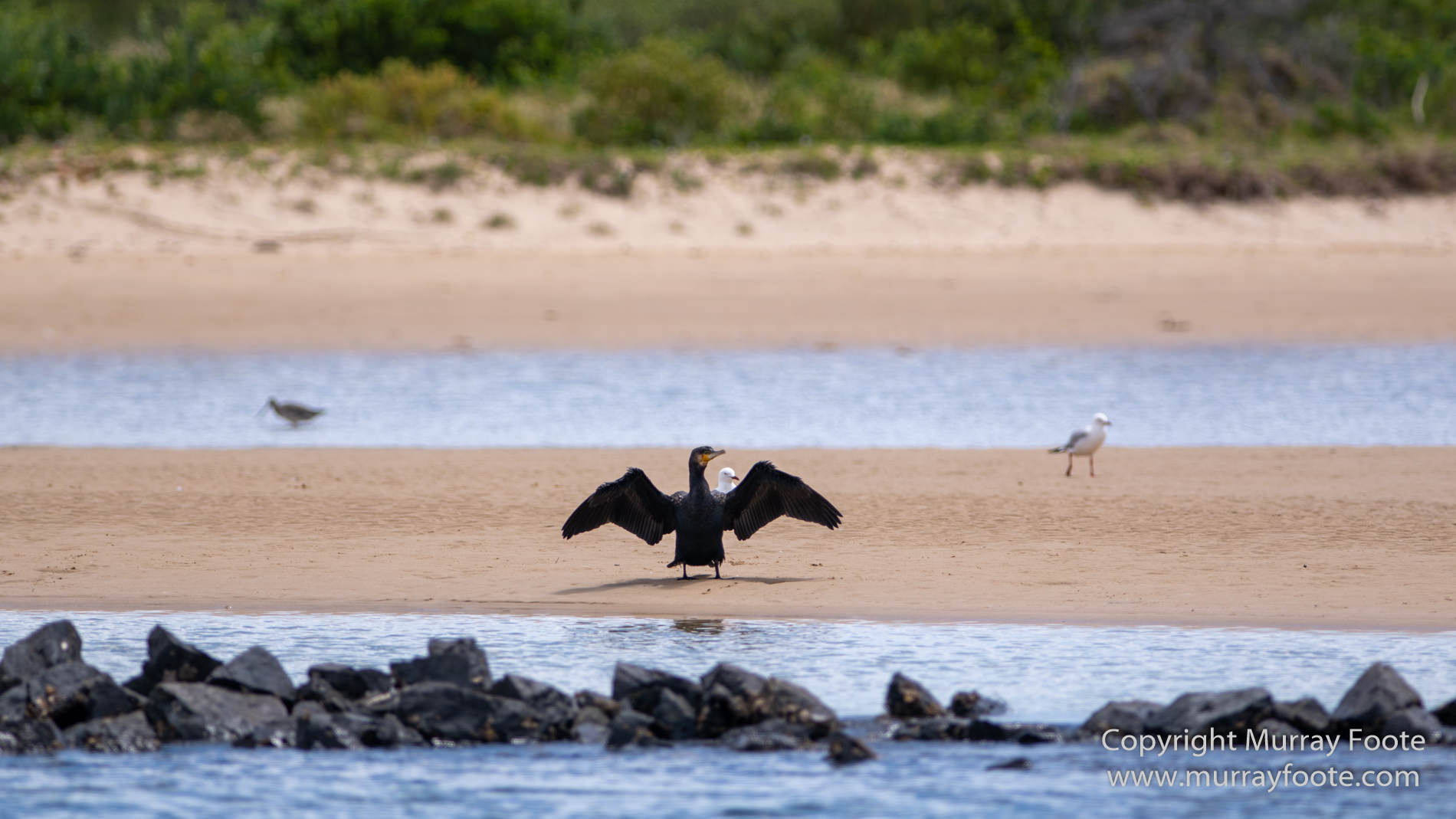 From the boat, underway but still inside Narooma’s Bar, a cormorant is drying its wings.