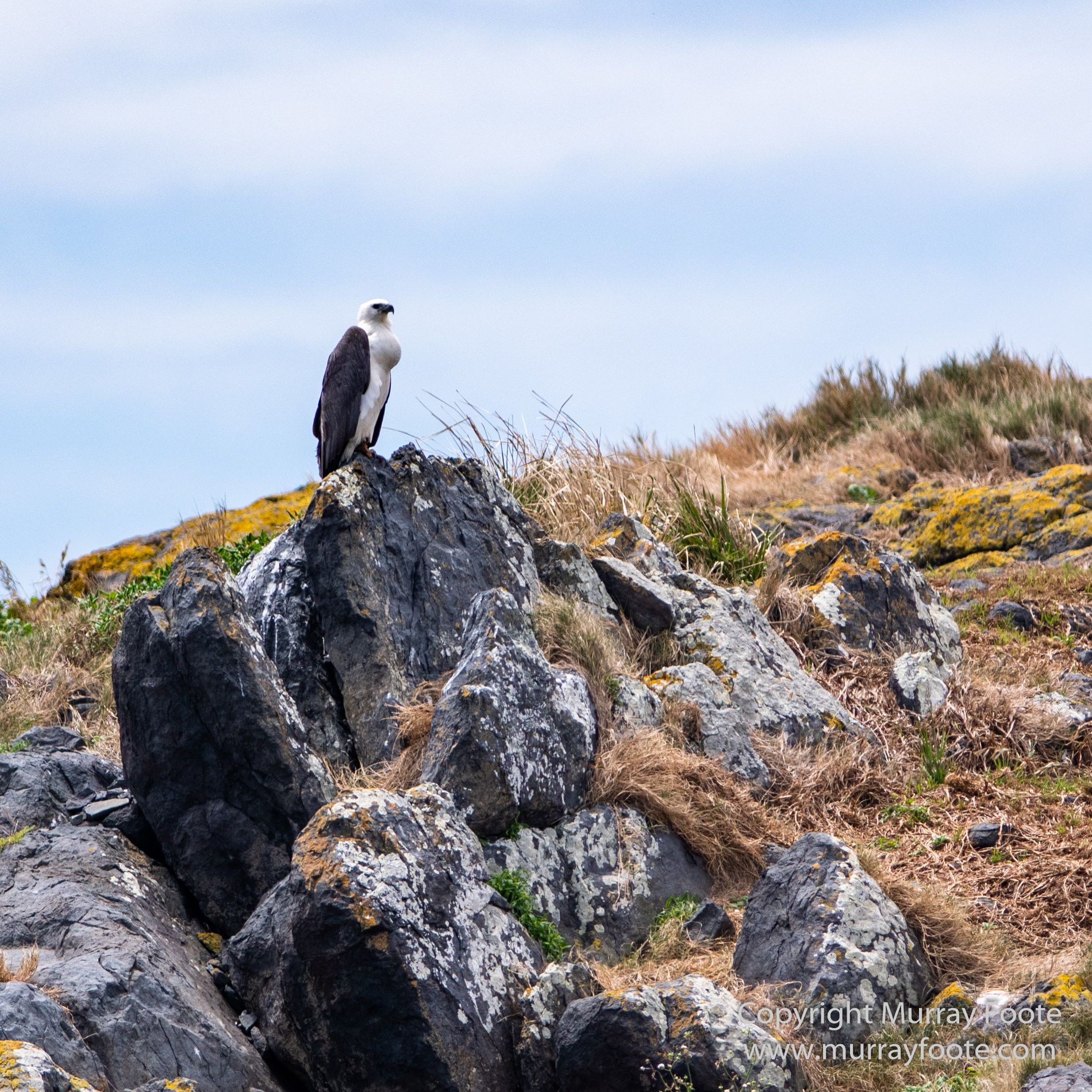 At some distance, sitting on his favourite rock, is this white-bellied sea eagle, in this case with a full crop. He does not live on the island but flies out every day from the mainland.