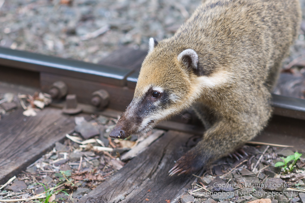 There is a narrow-guage train to ferry people to the various walks. While many people were waiting at one of the stations, several coatis (related to racoons) turned up in search of handouts. Here is one crossing the railway line.