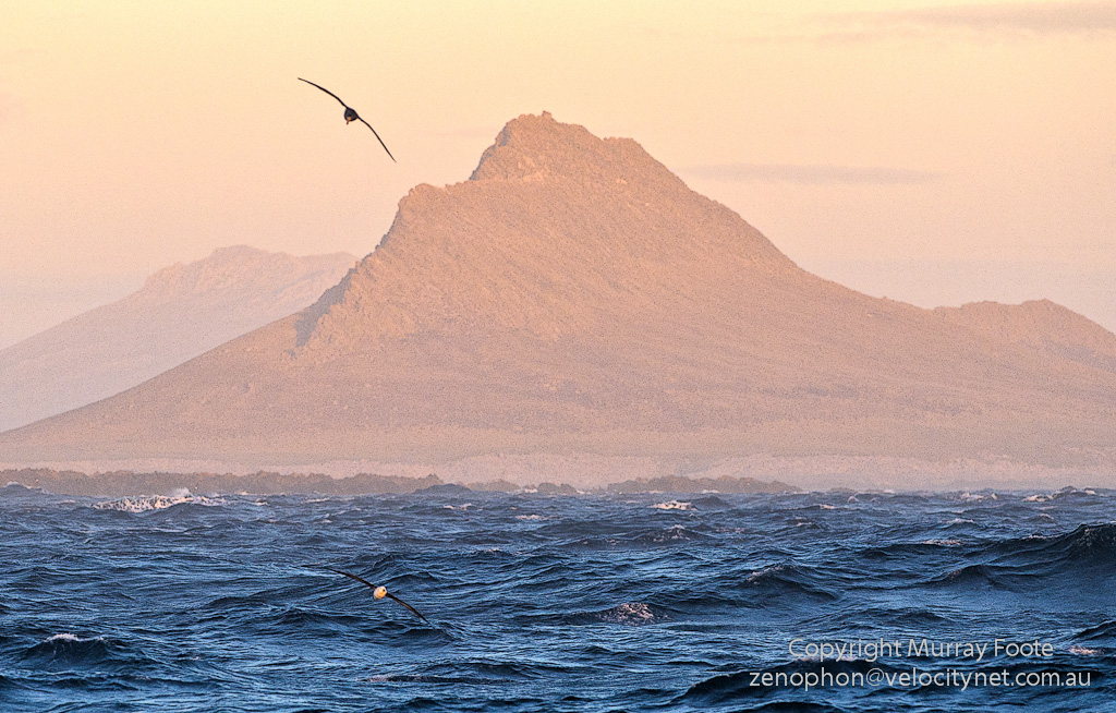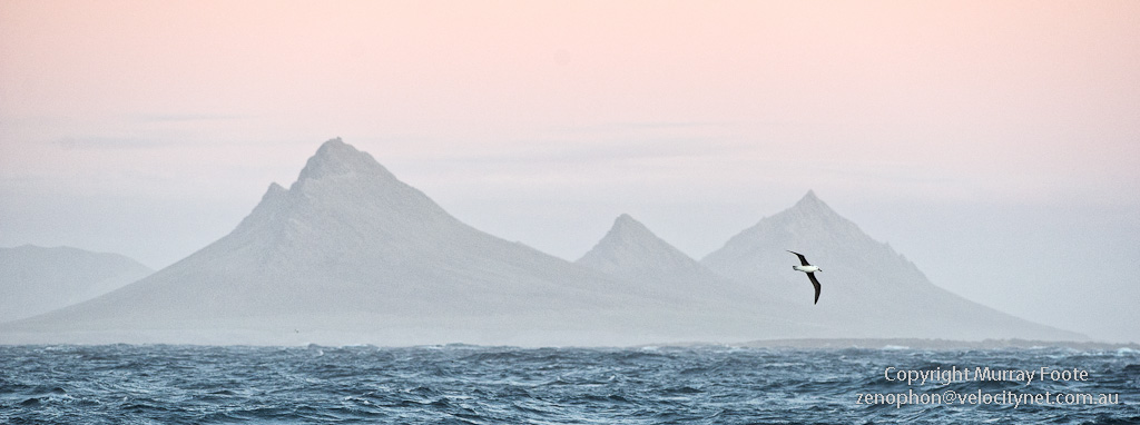 A black-browed albatross against Steeple Jason Island as sunset comes on.