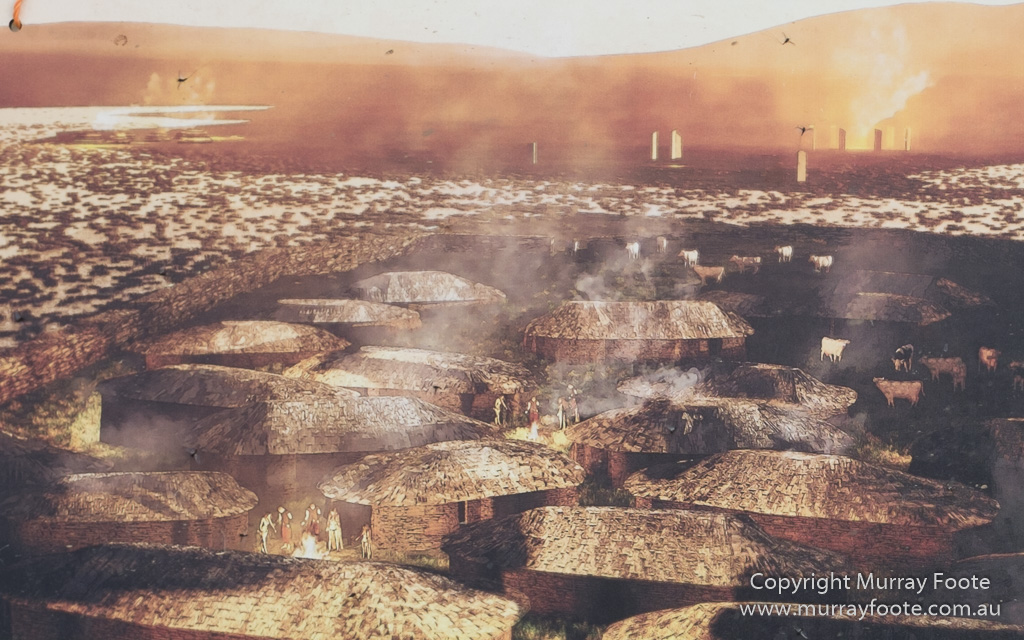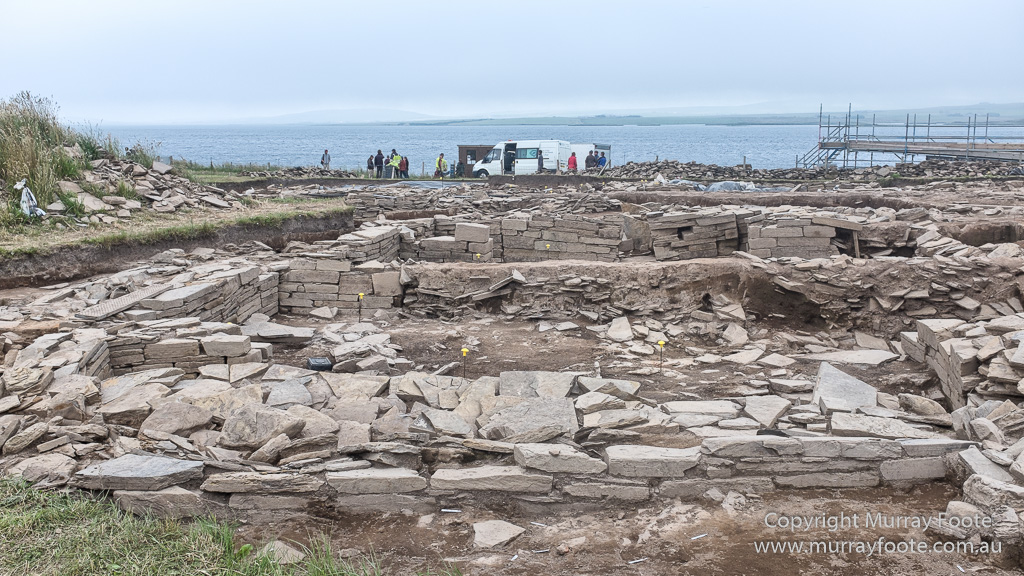 In use for about 1,000 years from 3200BC to 2300BC, the Ness of Brodgar was a remarkable ceremonial centre that was only recently discovered and is still largely unexcavated. It includes a massive “temple”, externally 25 x 20 metres (82 x 65 feet) though with walls five metres thick, so rather smaller inside. It appears to have been the centre of activities rather than the stone circles.