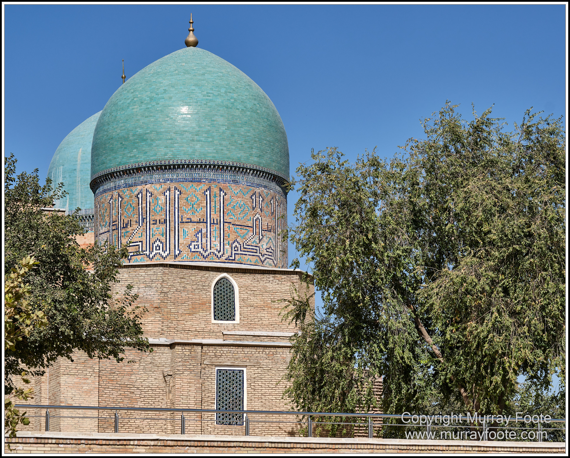 Here we see the nearby Dor-ut Tilovat ensemble which includes Kok-Gumbaz Mosque (the large dome), the Gumbazi-Sayidon Mausoleum (the two smaller domes) and a Madrassah. The mosque and one mausoleum was built by his Timur’s grandson Ulugbek, the left hand mausoleum was built by Timur.