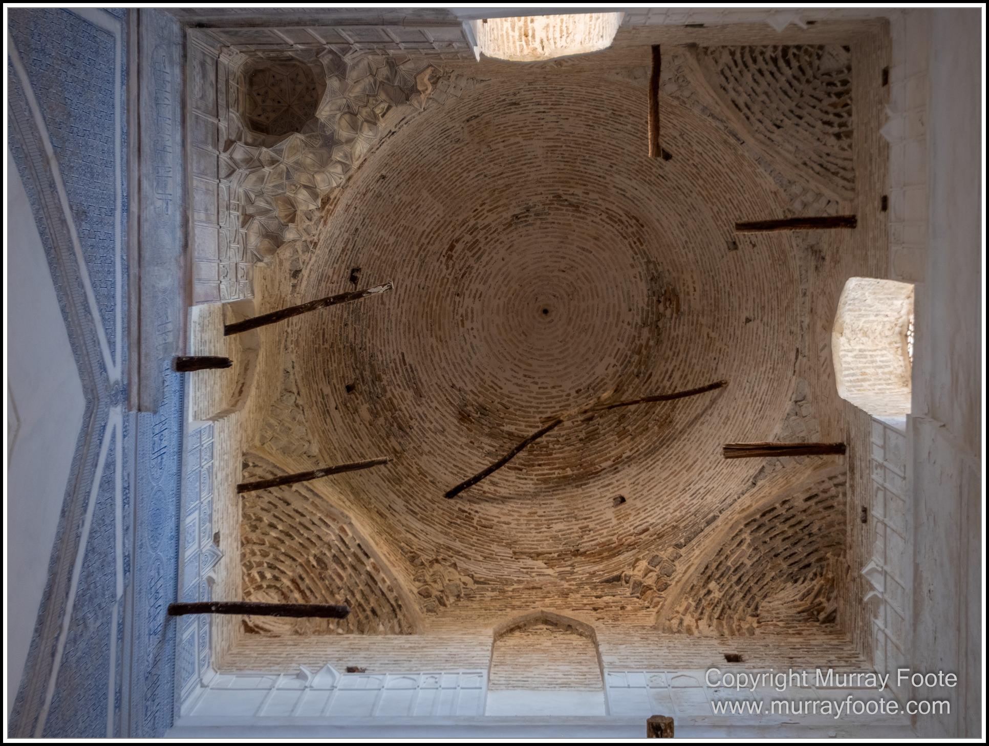 It was built on the foundations of an older mosque from the Karakhanid era (900 to 1200) and originally had a much larger dome. That collapsed in the late eighteenth century and was rebuilt two hundred years later. Judging by the apparent imperfections of the interior of the dome, they must have used original materials where possible.