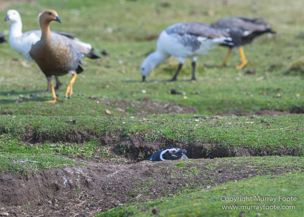 Magellanic Penguin peeking out of its burrow with upland geese in the background.