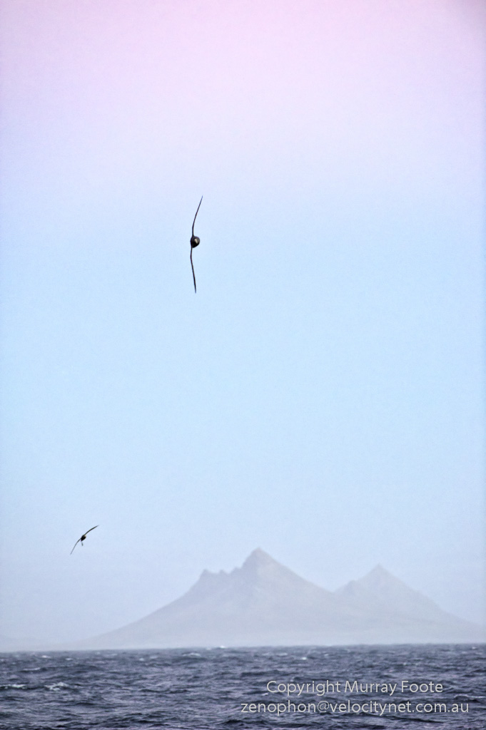 Two giant petrels in the sky as the Falklands recede and the sunset starts to fade away