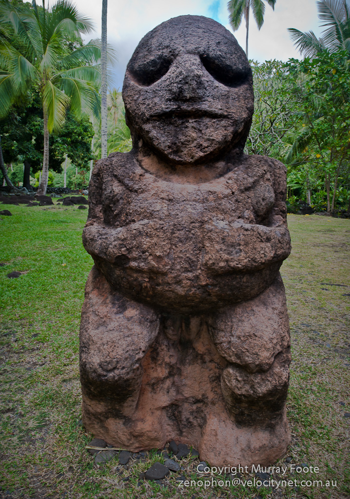 This is a corner of the tahua. The front figure shows some similarities to the moai of Easter Island. The moai were only carved from the waist up. However, here, as with the moai, the arms are at the sides and the hands meet at the waist. He also appears to have a topknot and the carving of the face shows, I think, some similarities.