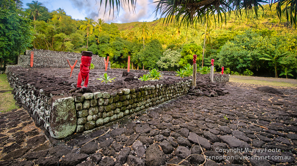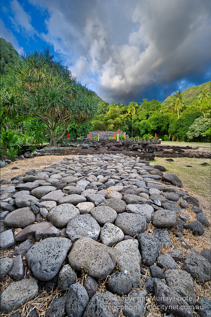 The image to the right shows the traditional stone pathway onto the marae, all the way up to the tahua (sacred courtyard) and the ahu (altar).